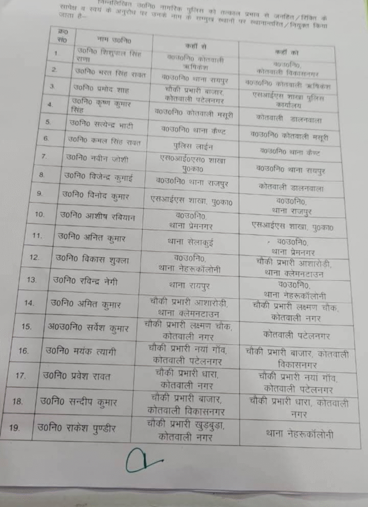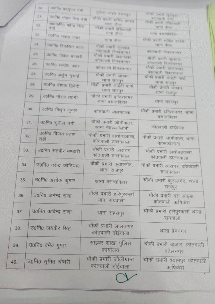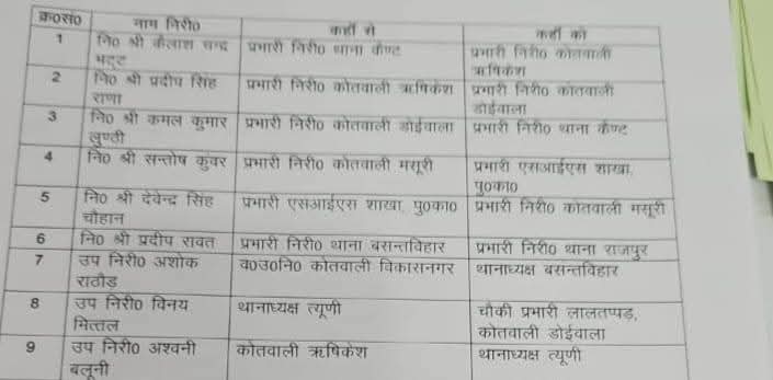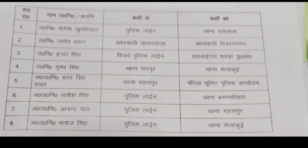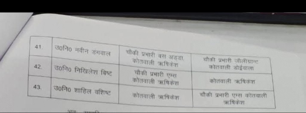 Categories Uncategorized ऋषिकेश, डोईवाला, रायवाला, देहरादून में कोतवाली, थाने, चौकी में बंपर तबादले, देखें सूची By admin Estimated read time 0 min read October 6, 2025 0 देहरादून जिले पुलिस कोतवाली, थाने और चौकी में बंपर तबादले किए गए हैं। ऋषिकेश, रायवाला, डोईवाला, देहरादून कोतवाली समेत कई थाने व चौकियों में प्रभारी को बदला गया है। कई सब इंस्पेक्टर को भी इधर से उधर किया गया है। देखें सूची