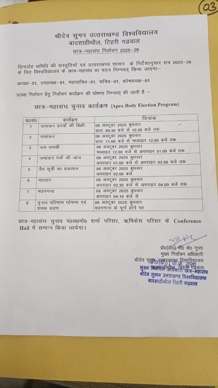 कल श्रीदेव सुमन यूनिवर्सिटी का छात्र महासंघ होगा। इसमें अध्यक्ष, महासचिव, सचिव, उपाध्यक्ष, कोषाध्यक्ष पद के लिए चुनाव लड़ा जाएगा। कल ऋषिकेश कैंपस में नामांकन होगा, और कल ही मतदान होगा, जिसके बाद चुनाव परिणाम जारी कर दिए जाएंगे।